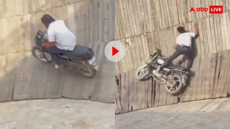 बाइक के नीचे गिरते ही शख्स का पैर भी लकड़ी की दीवार से रगड़ता हुआ नीचे आता है. ये नजारा देखकर किसी के भी दिल की धड़कन तेज हो जाए. एक पल के लिए सब कुछ थम सा गया, जैसे मौत ने अपना पंजा जमाने की कोशिश की हो. वो तो बाइक की रफ्तार तेज नहीं थी वरना एक बड़ा हादसा पेश आ सकता था.